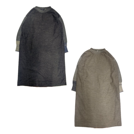 袖ニットワンピース NCOP-5623D ¥34,100身幅広めのストンとしたシルエットのワンピース。ギャザーがなくすっきりと着用出来ます。袖と衿はオリジナルニット。衿身頃部分裏付き、軽いブークレーを使用しています。nume11/27/2025